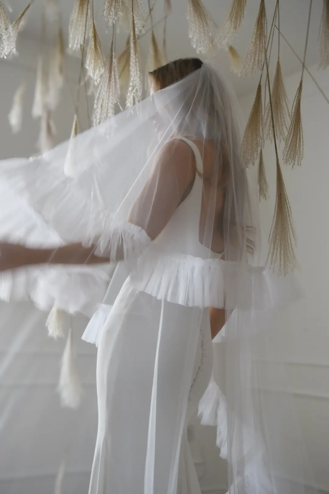 Bella is a double tier, gathered tulle edge full length veil, in our delicate, natural, sheer tulle. The blusher style adds tradition for the aisle for a very Romantic yet dramatic entrance. A very stylish veil complimenting any simple gown.